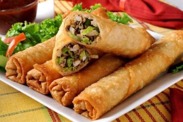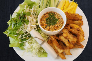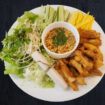 Deep-fried fish fillet, rolled with fresh veggies, mango, pineapple, and tamarind sauce.