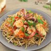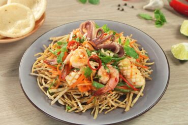 Bell peppers, herbs, green mango, carrot, basil, shrimp, squid.
