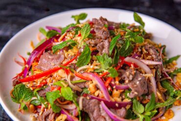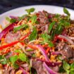 Bell peppers, herbs, green mango, carrot, basil, beef.